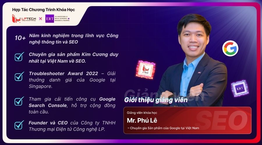 Giá trị đặc biệt của khóa học SEO EXECUTION chính là sự dẫn dắt của Ông Lê Văn Phú, Chuyên gia sản phẩm cao cấp trong lĩnh vực SEO. Đây là cấp bậc cao nhất trong Google Product Experts, chứng minh kiến thức chuyên sâu và những đóng góp nổi bật của ông trong cộng đồng SEO. Với vai trò đặc biệt này, ông không chỉ trực tiếp tham gia cải tiến Google Search Console, mà còn hỗ trợ cộng đồng người dùng trên toàn cầu.