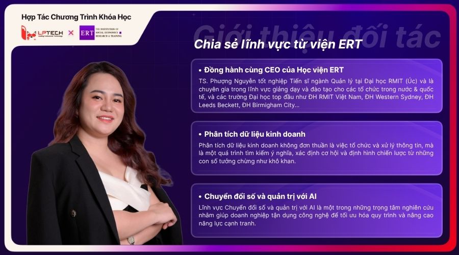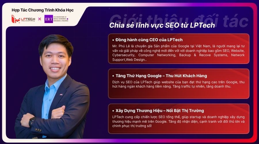 Khóa học SEO EXECUTION nằm trong khuôn khổ hợp tác giữa LPTech và Viện Đào tạo và Nghiên cứu Kinh tế - Xã hội (ERT). Chương trình đào tạo SEO thực chiến, giúp các bạn học viên không chỉ nắm chắc các kiến thức lý thuyết mà còn áp dụng hiệu quả thực tế cho doanh nghiệp của mình.
