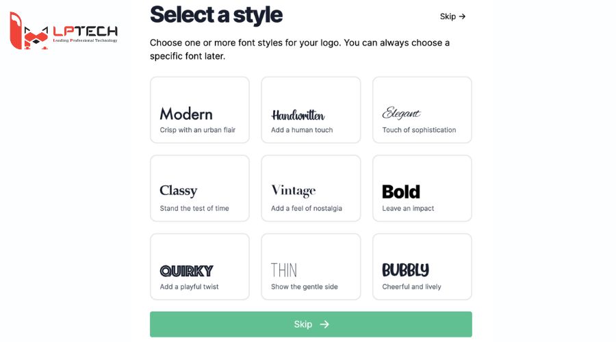 Bước 2: Tại đây, bạn có thể lựa chọn phong cách logo dành cho thương hiệu của bạn. Bấm chọn Continue.
