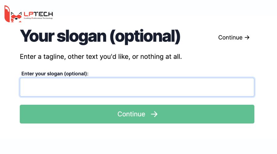 Bước 2: Tại đây, bạn hãy nhập câu slogan muốn thêm vào logo và nếu không có thì bạn có thể bấm Continute để bỏ qua.