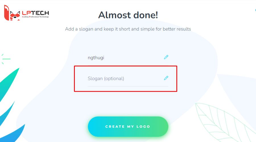Bước 4: Thêm câu slogan cho logo. Chọn “ Create my logo” để tiếp tục quá trình thiết kế logo